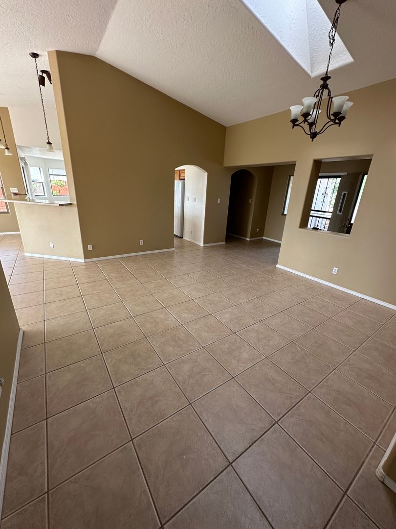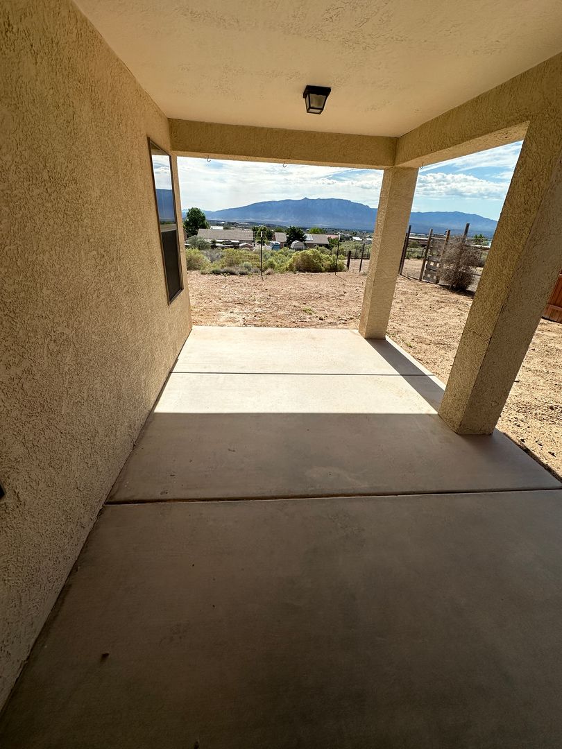 Discover 808 7th Street NE in Rio Rancho, a spacious single-family home with 4 bedrooms and 2 full bathrooms on a generous 1/2 acre lot. The interior features tile throughout common areas, carpeted bedrooms, ceiling fans, skylights, an eat-in kitchen with pantry, electric range, microwave, dishwasher and disposal, plus a master suite with walk-in closet, double sinks and a garden tub. Practical amenities include evaporative cooling, gas heat, refrigerator, washer/dryer hookups, laundry room, blinds and a 2-car garage with opener. Enjoy mountain views from the property, a covered patio, fenced backyard, southwest landscaping and a dirt-backyard area. Utilities are tenant-paid; the home uses city water and a septic system (septic addendum required). Lease terms include a 1-year lease, required renters insurance, no cats, a non-refundable pet fee of $250 per pet, $25/month pet rent per pet, and a $145 lease administrative fee due at lease execution.